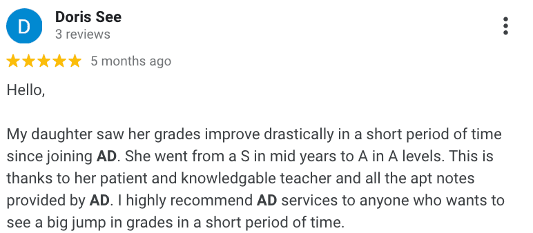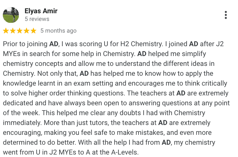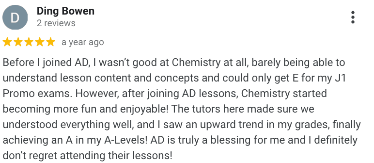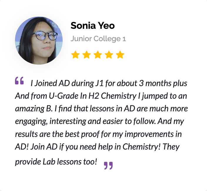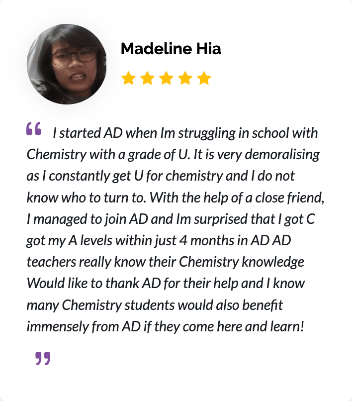 AD's teaching team consist of ex-MOE HOD/NIE teachers, Full-time tutors with (Degree, Masters or even PhD in Chemistry) and has amassed a wealth of chemistry teaching experience having coached more than 2000+ 'O' & 'A' level Chemistry students including IP chemistry tuition with varying abilities from different secondary schools & JC! (We take in ALL students regardless of their starting point!)